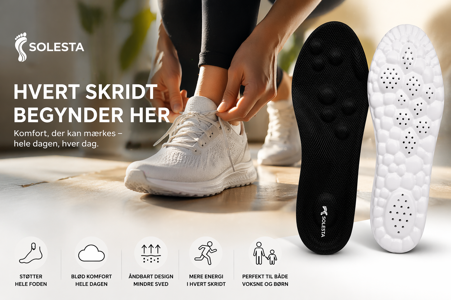 Solesta er udviklet til at give din fod den støtte, den mangler i hverdagen. Med indbygget svangstøtte og stødabsorbering reducerer du belastningen og forbedrer din holdning.